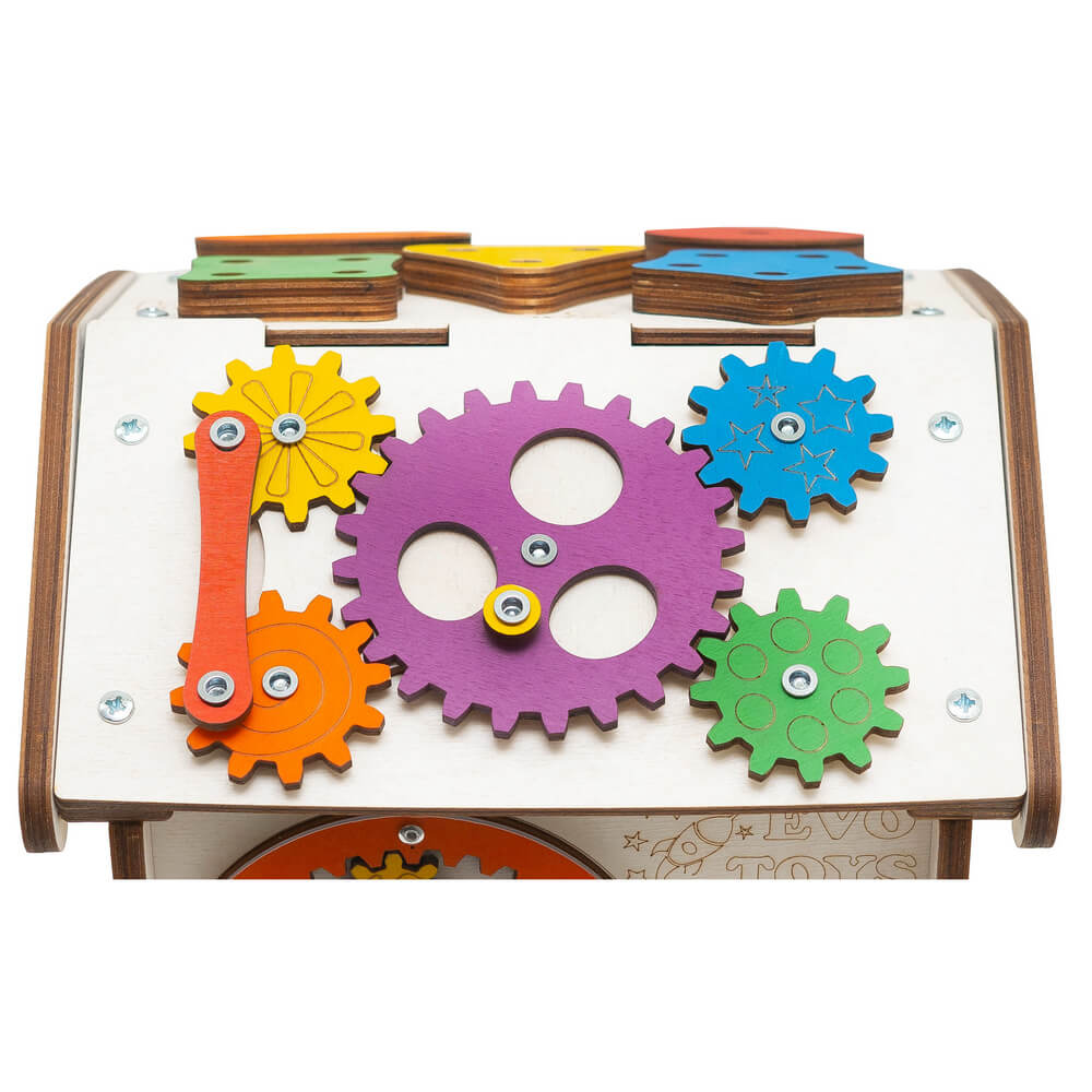Небольшой, но очень функциональный бизидом, с помощью которого ребенок развивает цветовосприятие, укрепляет память, тренирует мелкую моторику и даже учится считать. А два десятка интересных элементов (сортеры, лабиринты, шестеренки) не дадут скучать ни годовалому малышу, ни дошкольнику!